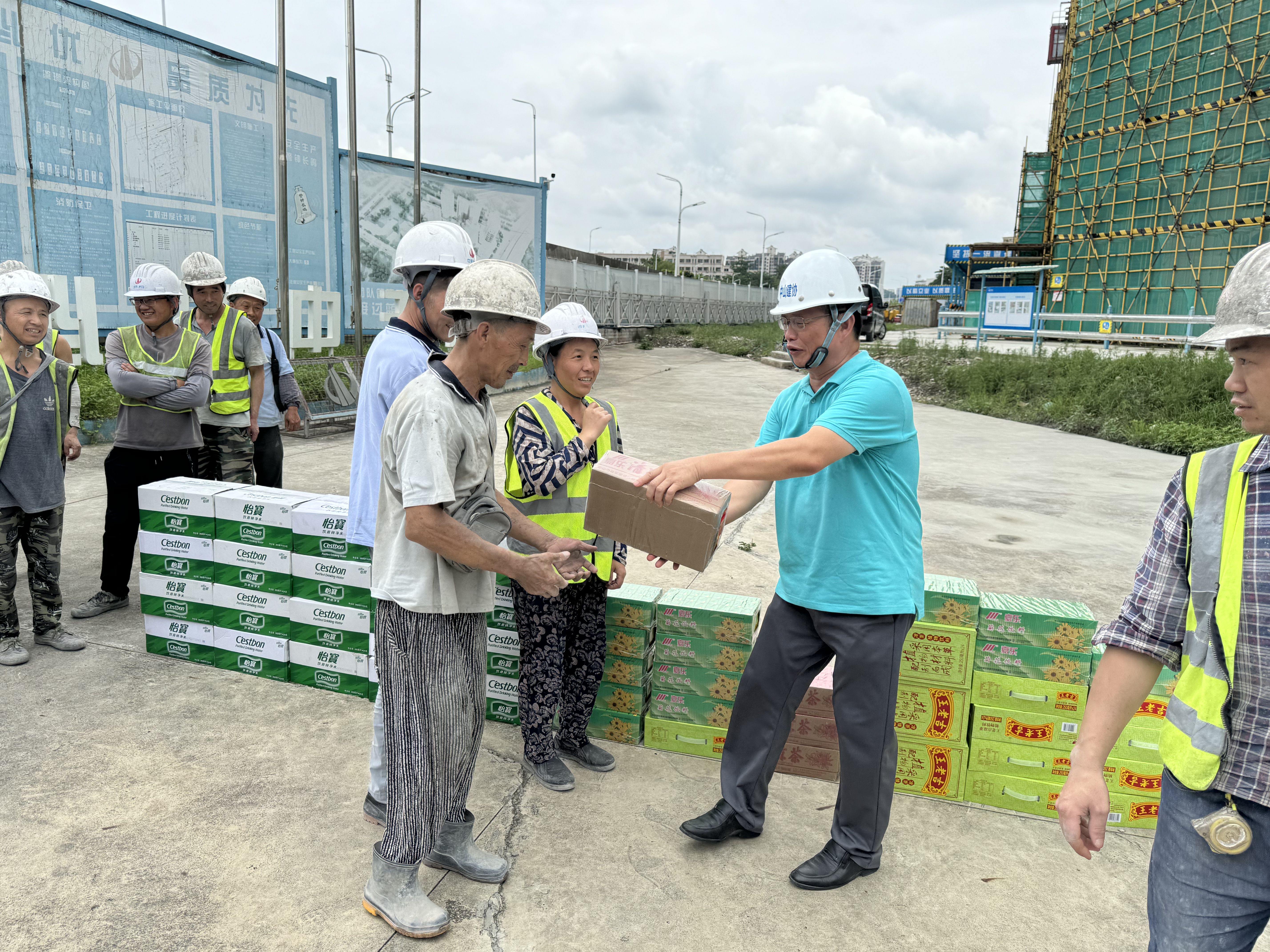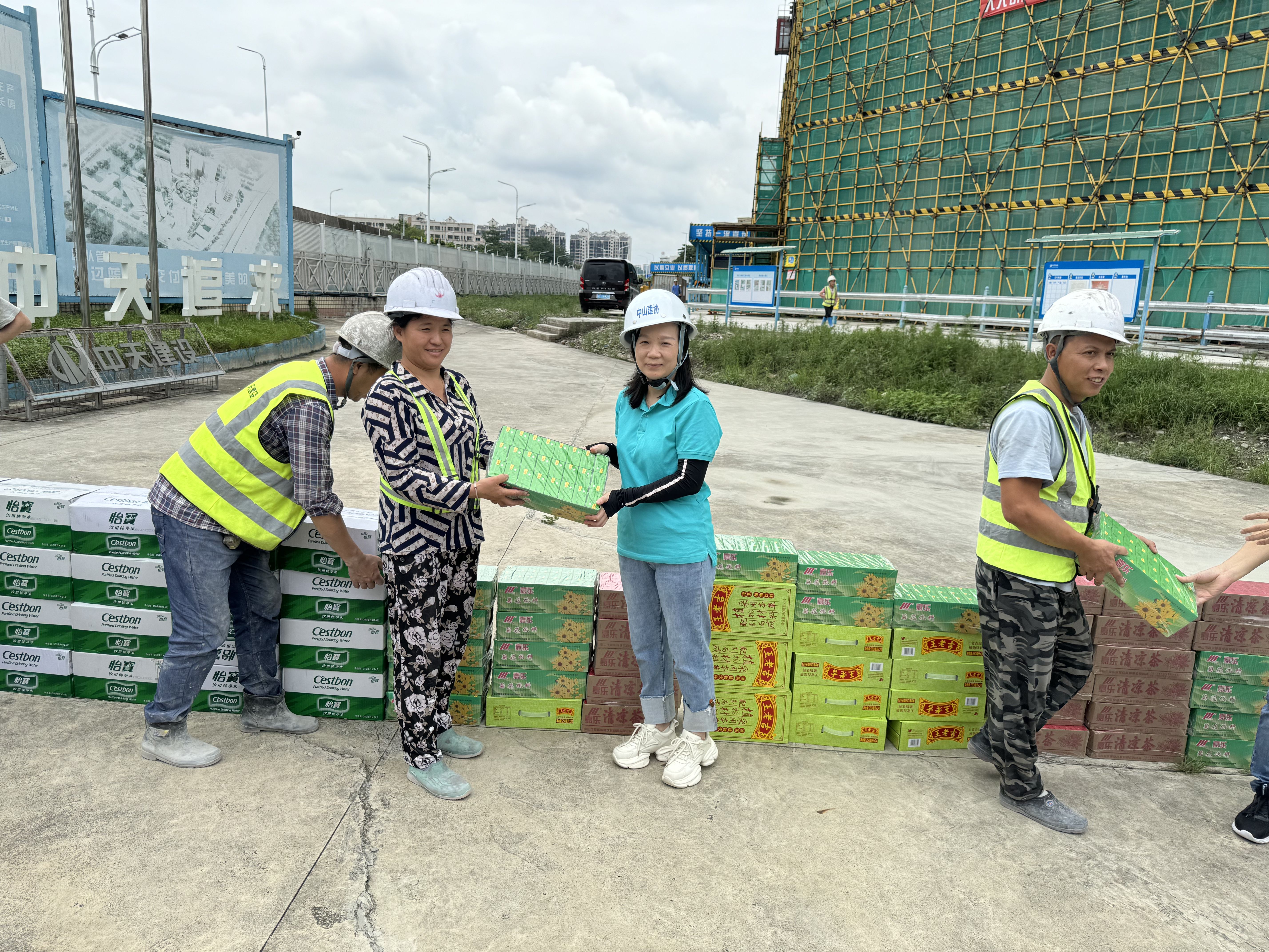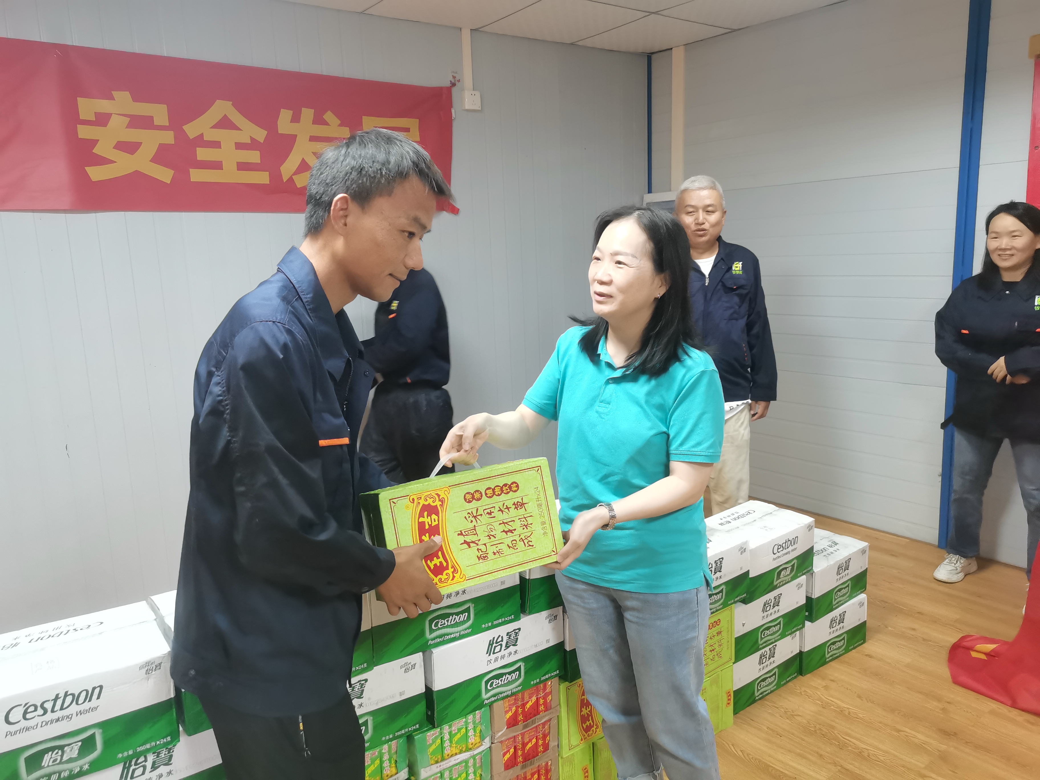 协会送上清凉茶、菊花茶、矿泉水等清凉饮料,关心慰问高温下坚守岗位的一线职工。行业工联会主席陈秋霞提醒施工单位要根据夏季高温特点,落实主体责任,合理安排作息,始终把安全生产摆在首位,做好户外作业职工的劳动保护工作,确保一线工人平安度夏。
